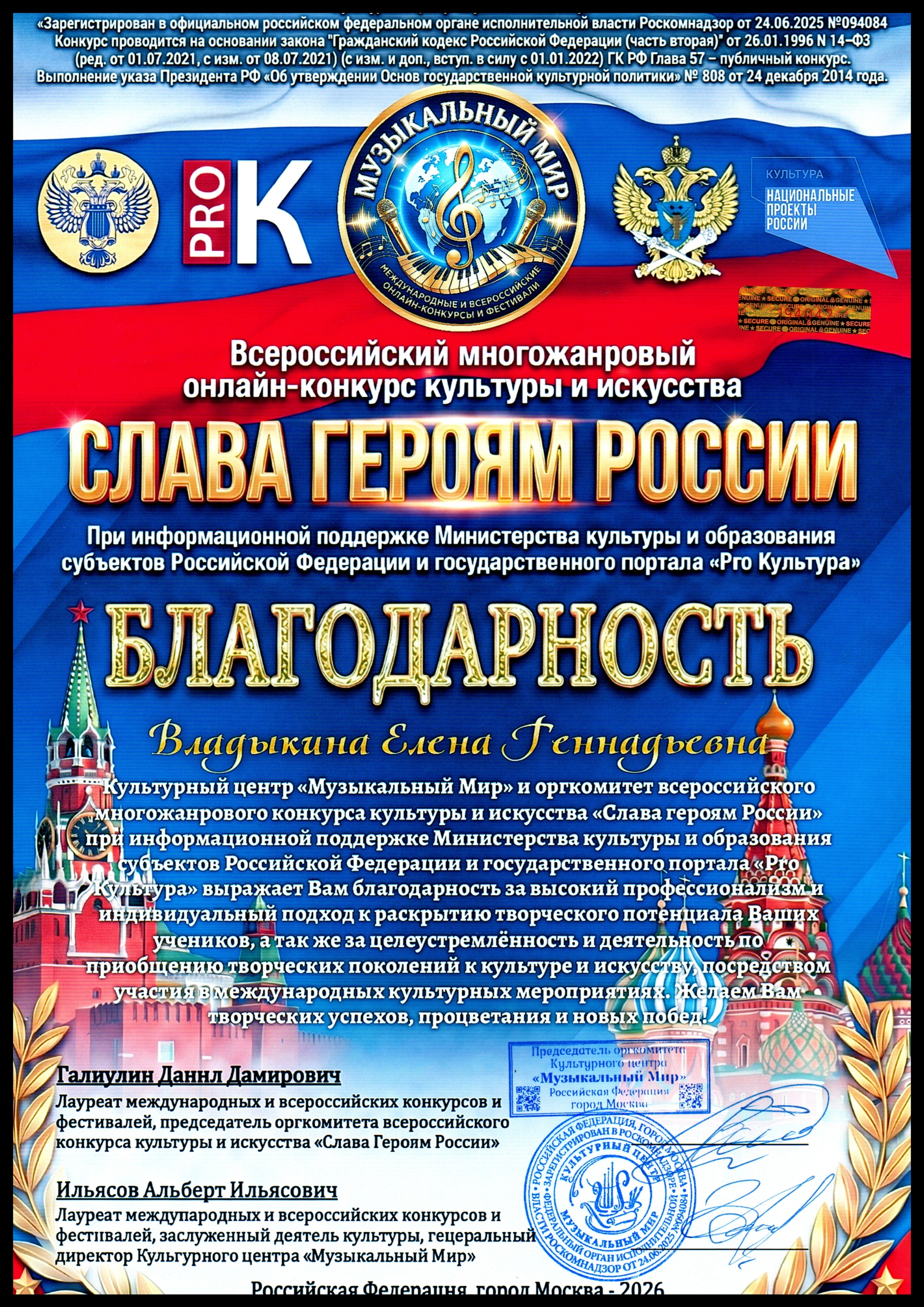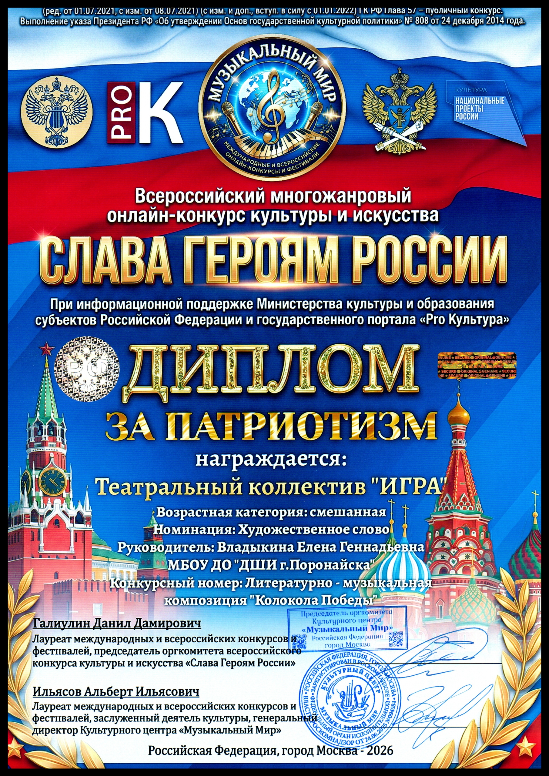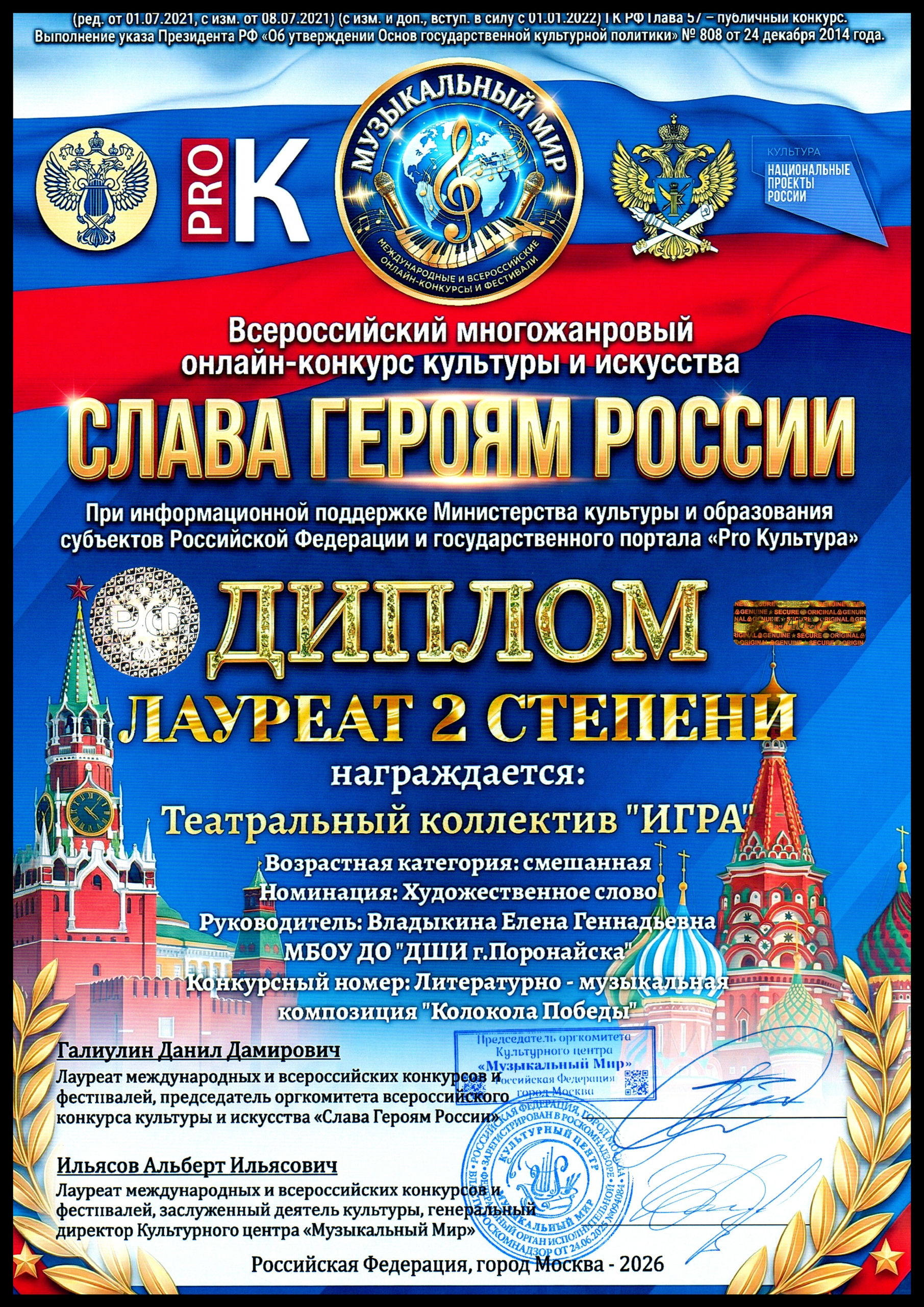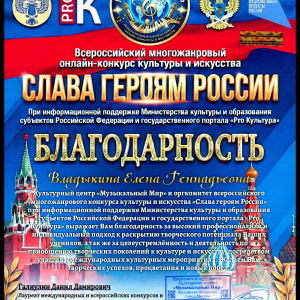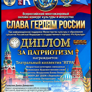 Диплома Лаурета II степени удостоился театральный коллектив «ИГРА» преподаватель Владыкина Е.Г. в Всероссийском многожанровом онлайн-конкурсе культуры и искусства «Слава Героям России» (конкурс проводится при поддержи Министерства культуры и образования субъектов РФ и государственного портала «Pro Культура»).