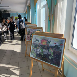 Экспозиция была приурочена к грядущему празднику мужества и чести. Юные художники представили лучшие живописные и графические работы.